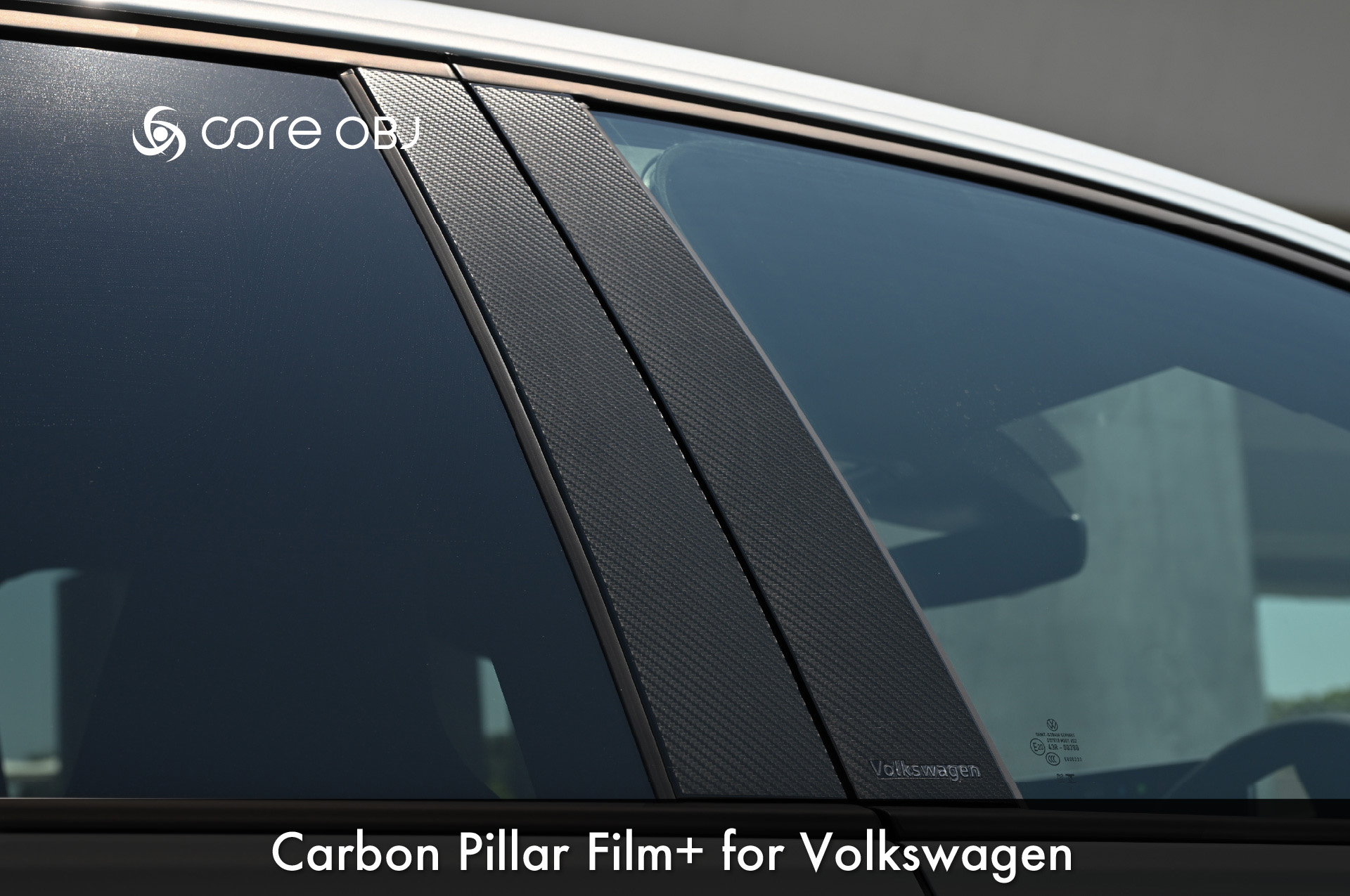 core OBJ Carbon Pillar Film+ for Volkswagenは、Volkswagenロゴがピラー部にある車両に対応した窓付きカーボンピラーフィルムです。車種専用の形状で、曲面にも追従する貼りやすいピラー用フィルムです。簡単な施工で本格的なカーボン柄のピラーにイメージチェンジすることができ、ドレスアップとピラー部の保護効果を実現します。