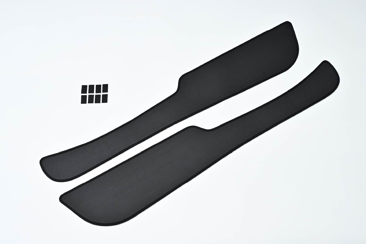 表面は3Dカーボン調のレザー素材を使用。裏面は4mm厚の高密度ウレタンをラミネートしている為クッション性が高く、ドアパネルに優しくフィットします。取り付けは強力粘着テープとマジックファスナーを使用。簡単に脱着が可能です。