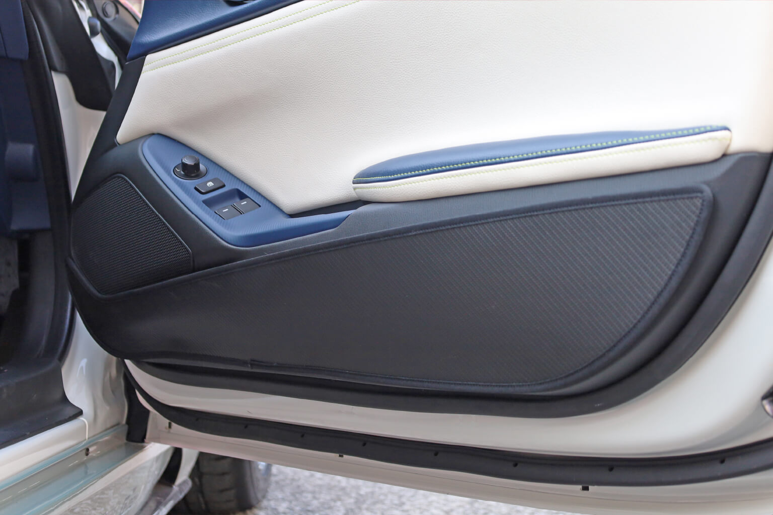 表面は3Dカーボン調の合成ラバー素材を使用。裏面は4mm厚の高密度ウレタンをラミネートしている為クッション性が高く、ドアパネルに優しくフィットします。取り付けは強力粘着テープとマジックファスナーを使用。簡単に脱着が可能です。