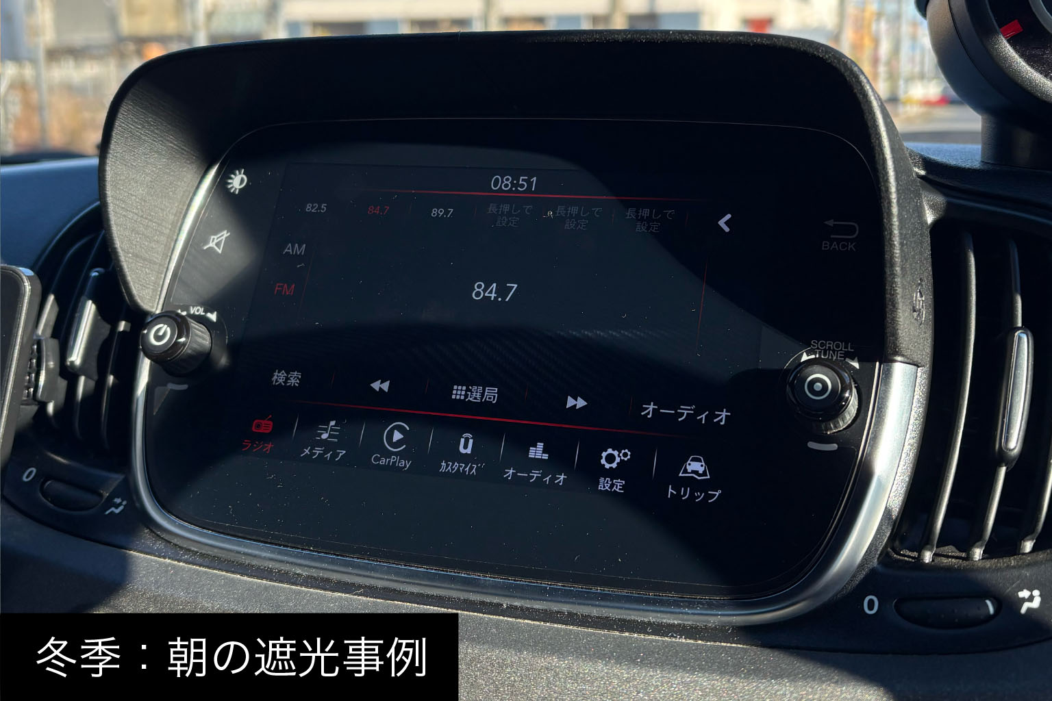 ※本製品は直射日光による画面の映り込みを軽減することを目的としています。※ 季節・時間帯・太陽の照射角度・走行環境により、遮光効果は異なります。 |